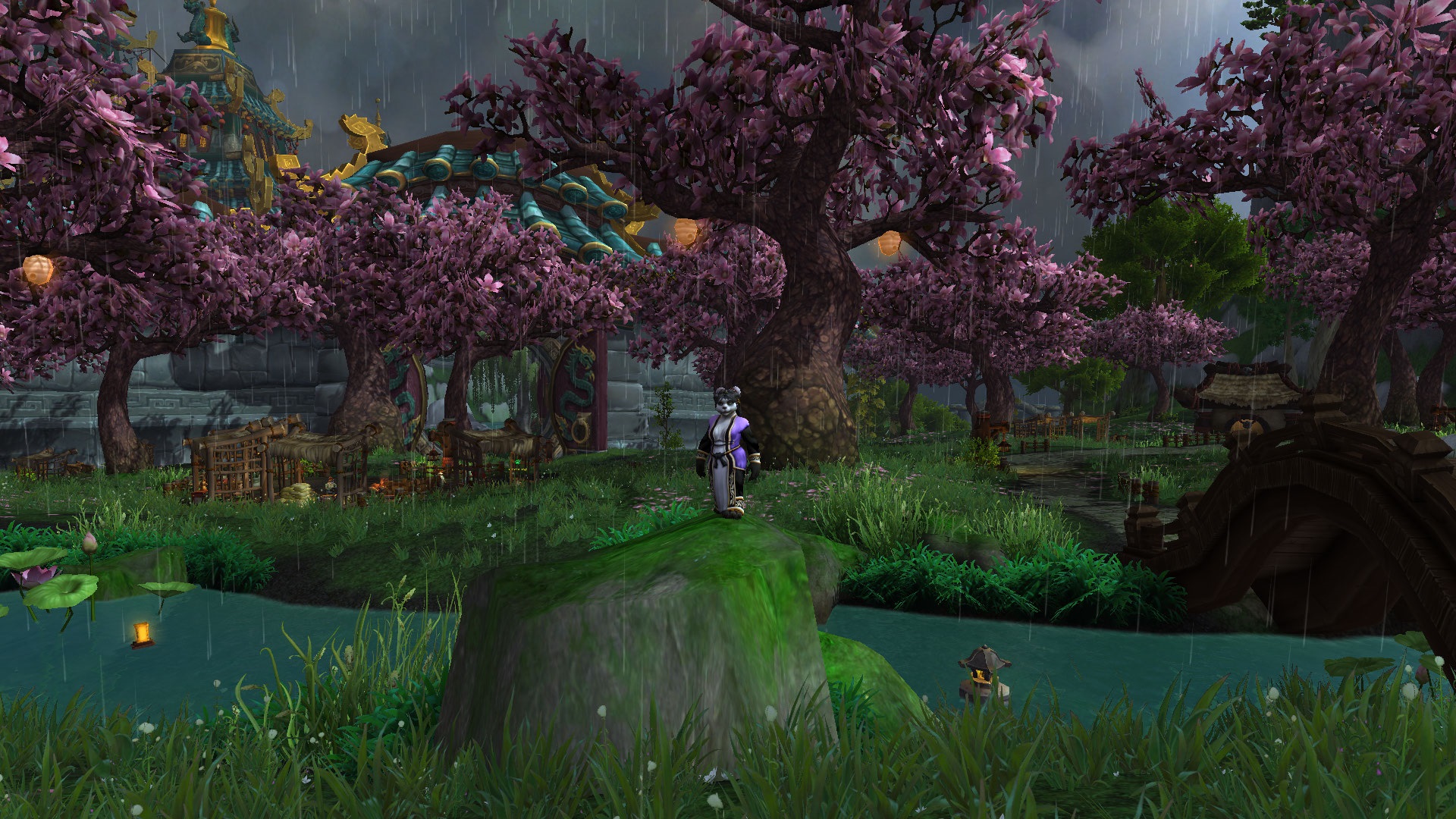The continent of Pandaria represented a huge step forward in terms of the quality of artwork; almost every place in Panda-land is beautiful. But the Arboretum stands out even compared to the rest of the continent. Full of cherry trees in blossom, a meandering river speckled with floating candles, and a spectacular view of both plummeting seaside cliffs and the majestic Temple of the Jade Serpent. Pandaren craftsmen go about their business in rustic buildings and bamboo huts while adorable giant caterpillars (technically silkworms) wander amongst the lush grass.