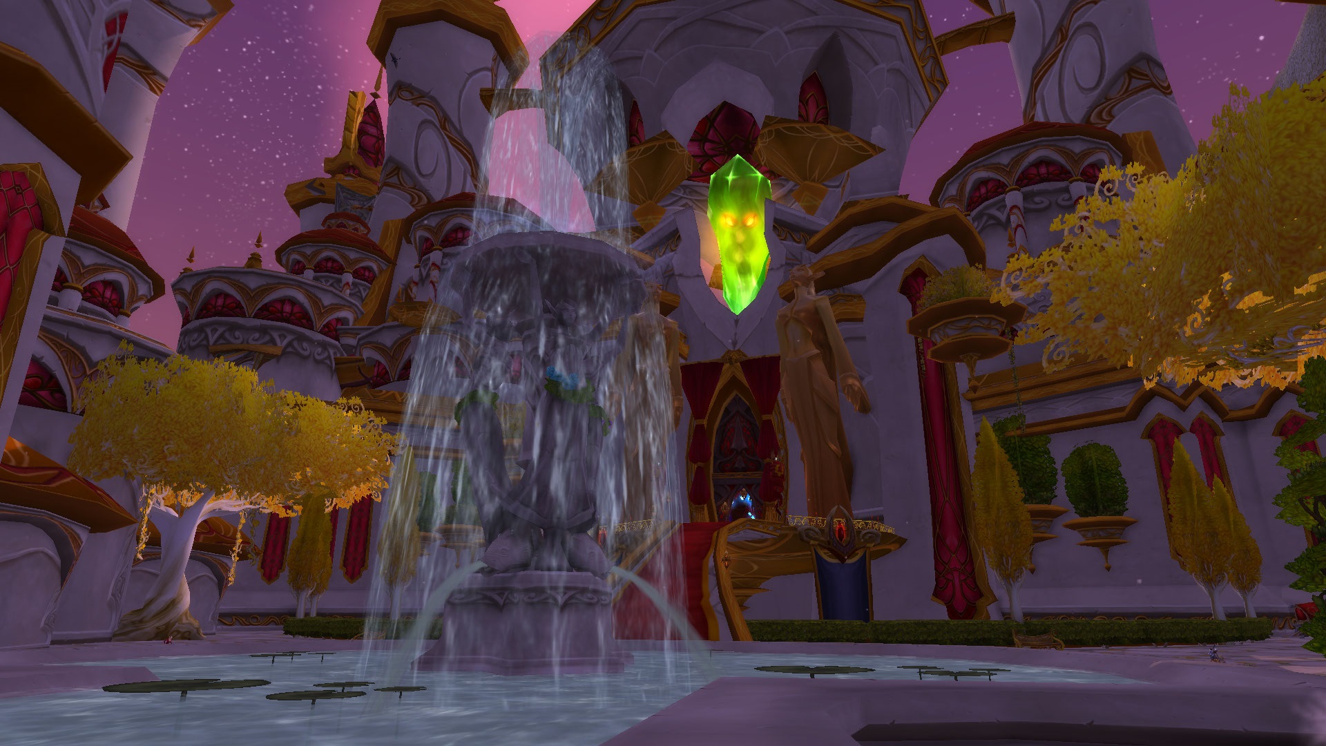 My main–the first character I ever rolled in World of Warcraft–is a Blood Elf, so this was kind of a given. I was mesmerized from the first moment I stepped through the main gate of this decadent paradise. White marble streets and buildings are given splashes of color with the Blood Elves’ signature crimson and gold banners. Sheer silk curtains are draped across the entrances of many buildings filled with plump lounging cushions. It’s a city build for the comforts of a race of arrogant hedonists and I love every inch of it.