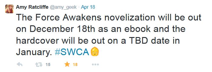 The Novelization For The Force Awakens author and release date revealed (tweet courtesy of Star Wars Insider and Starwars.com writer Amy Ratcliffe):