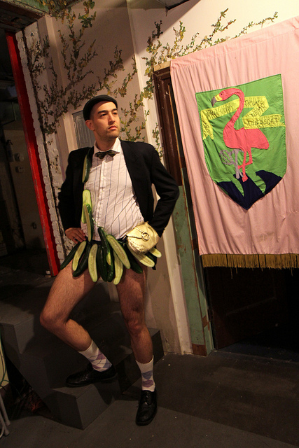 But what exactly is GISHWHES? The scavenger hunt challenges teams of 15 people to capture images from a long list that is published as soon as the event goes live. Some items on the list need to be created from scratch, such as drawings, craft projects, or wacky costume pieces (such as a kilt made of sliced cucumbers, pictured left). Others require participants to take photos of themselves in unusual (and usually very public) situations. And many require a combination of both: for example, one year a GISHWHES item was to submit a photo of yourself shopping for diamonds at a fancy jewelry store while wearing a wig made entirely out of cheese puffs.
